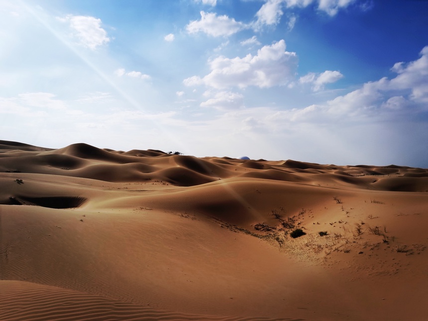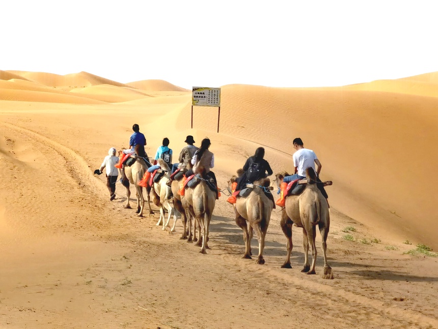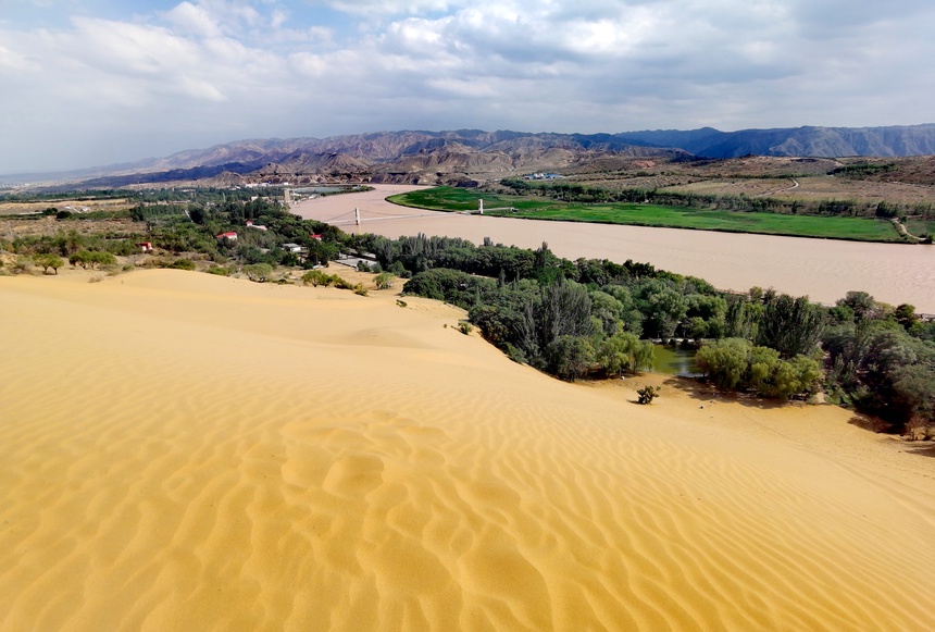 如今,这里成了“星星的故乡”,是游客欣赏星空的圣地。腾格里沙漠生态系统类型比较丰富,涵盖荒漠、草地、林地、农田和湿地等生态系统类型,沙坡头景区的旅游产品也因此丰富多样。我们滑沙而下至黄河边,乘坐羊皮筏子在黄河上漂流,筏子随波逐流,水花溅起处凉意沁人。撑筏的老乡唱起了民歌:“黄河水,长又长,哥哥撑筏走四方……”歌声粗犷而深情,与黄河水声交融在一起。(宾阳 摄)