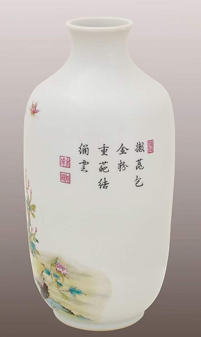“锦鸡洞石花卉灯笼尊”,高度26厘米、腹径13.5厘米、口径5.6厘米、足径8.3厘米,落“大清雍正年制”楷书六字款。画面构图为锦鸡、芦苇、牡丹、奇石。画面丰富,层次较多。锦鸡一雄一雌,在花丛中准备捉一螳螂,雄性锦鸡正在回首相望,情趣盎然;所绘芦苇似在风中摇曳,叶子的色彩异常丰富,显示宫中画师高超的绘画水平;锦鸡羽毛笔触极为精细,色彩变化层次丰富,表现力十分强有力。画面题字为“嫩蕊包金粉,重葩结绣云”,五言诗文,引手印“佳丽”,落款印章为“金城”“映旭”。