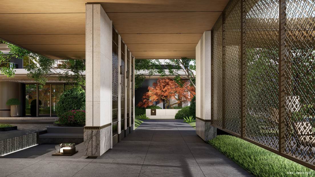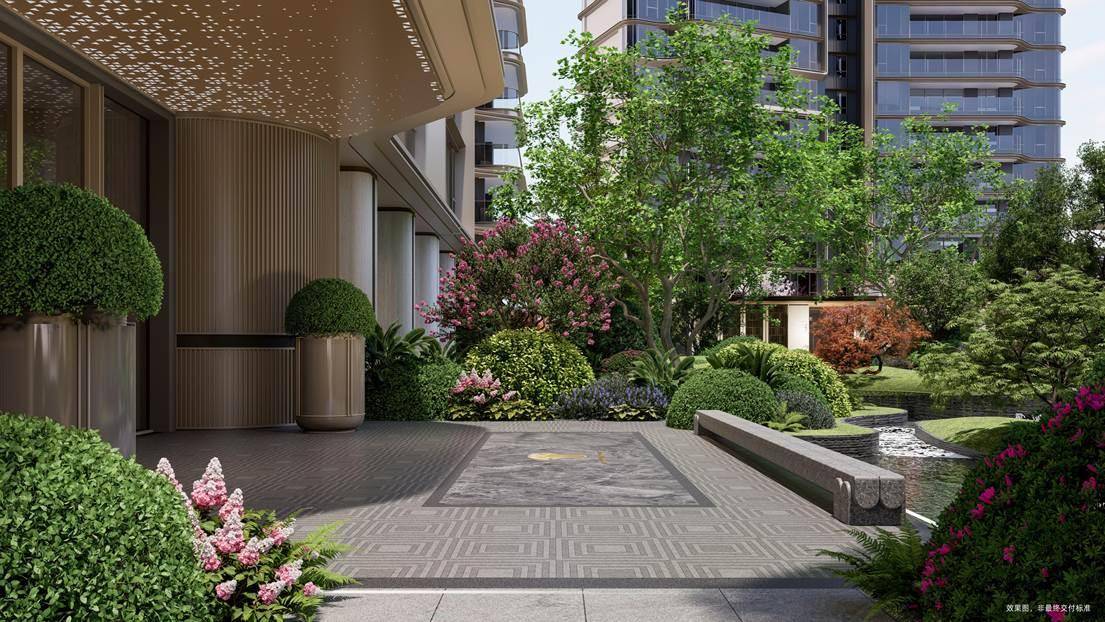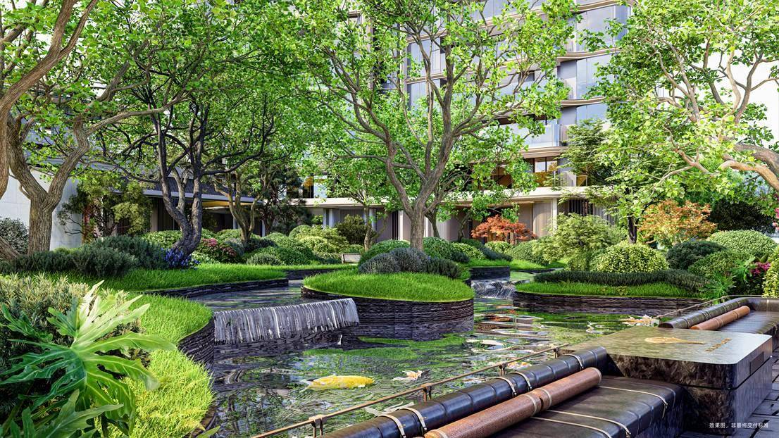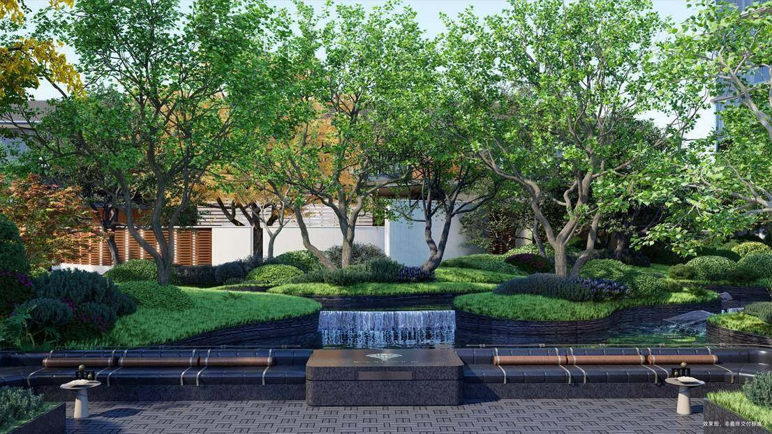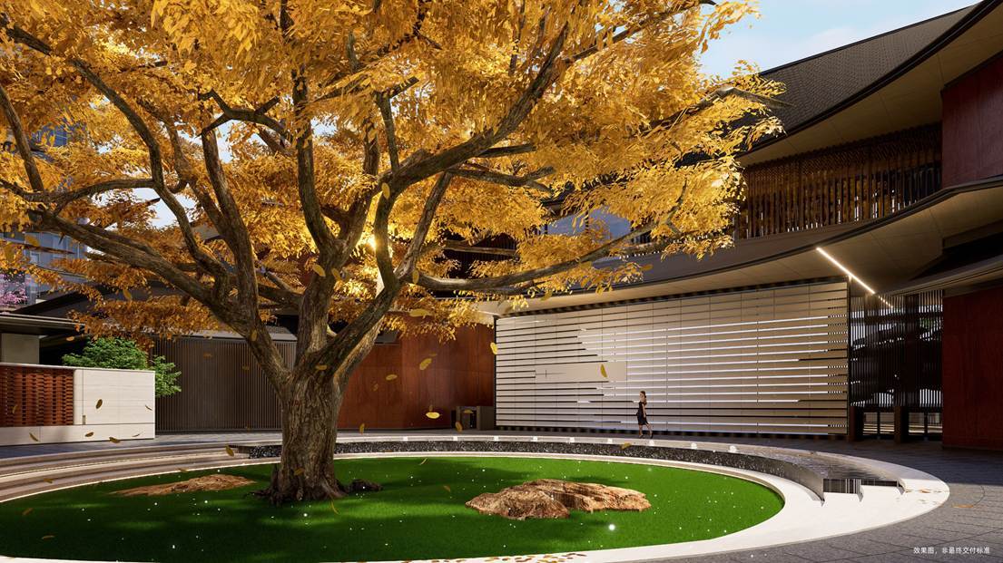 项目选材兼具匠心与寓意:特选罗汉松、乌桕林、红果冬青等珍稀苗木,搭配保加利亚沉香米黄、巴西铂金钻奢石等进口石材,通过竹韵织地、金叶织脉等细节,实现“内敛文脉・外放活力”。