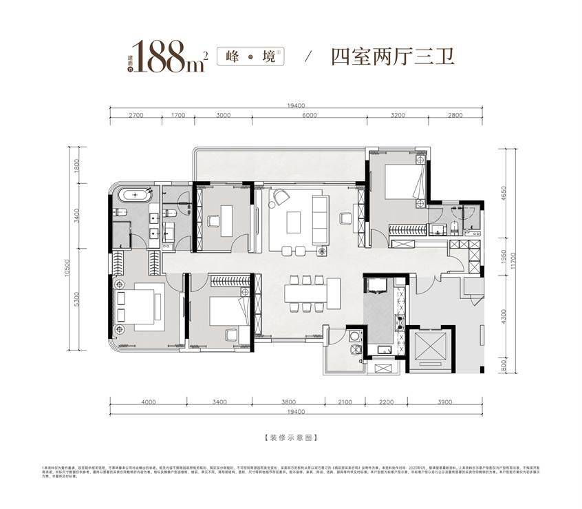 建面约170-230㎡全精装四房产品,坚持空间平权与舒适优先原则:C字型楼栋布局实现270°观景视野,端厅+宽幕阳台设计将阳光与园景引入室内,LDKG一体化格局放大公共活动空间;双主卧套房配置独立卫浴与衣帽间,满足多代同堂或高端客群的私密需求。