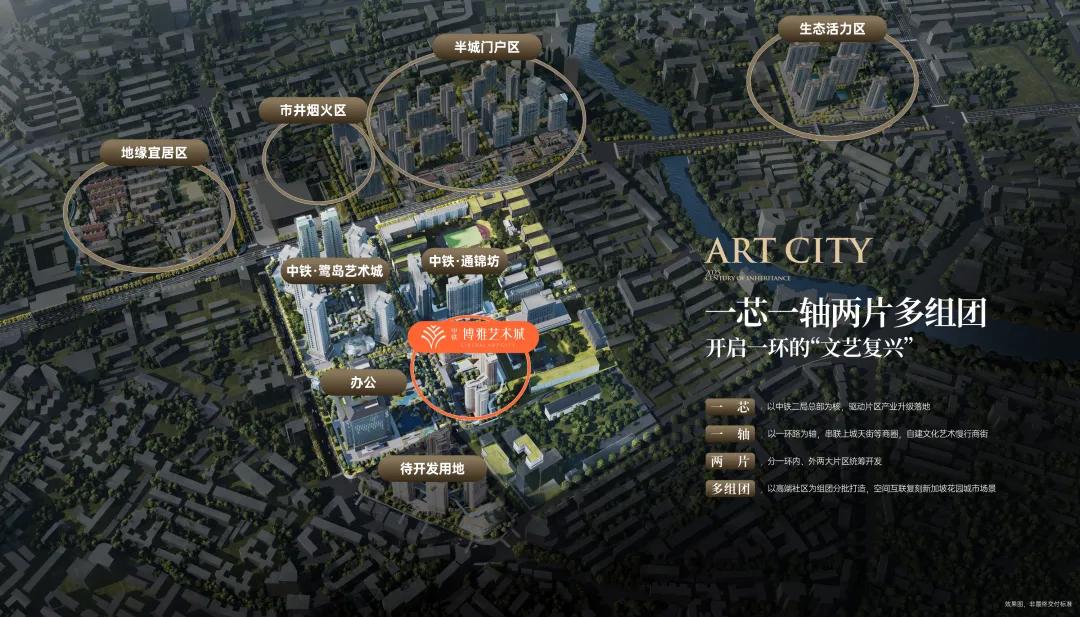 作为中国中铁二局深耕成都一环的超400亩城市更新项目,中铁艺术城并非简单的住区开发,而是以“系统性重构城市功能”为纲领,量身定制“一芯一轴两片多组团”的规划骨架。