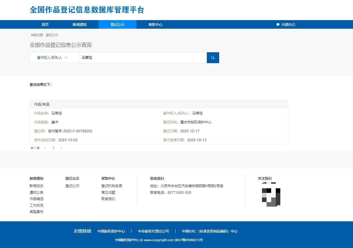 近日,据全国作品登记信息数据库管理平台官网显示,马常旭名字已注册成版权,登记机构为重庆市版权保护中心,登记日期为2025年10月17日。