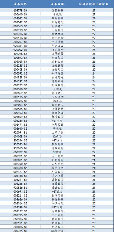 电力设备行业的上榜企业前五名分别为天际股份、海科新源、中超控股、中恒电气、*ST沐邦,分别为30次、24次、22次、20次、20次。