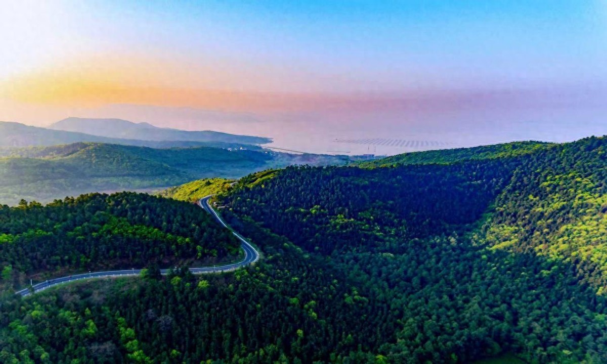风景道蜿蜒入林海,远处湖景在霞光中泛着柔波