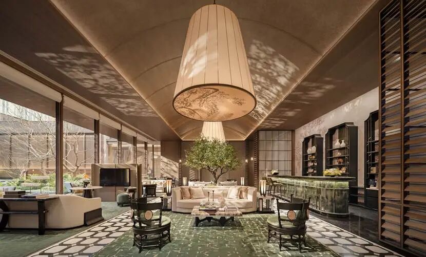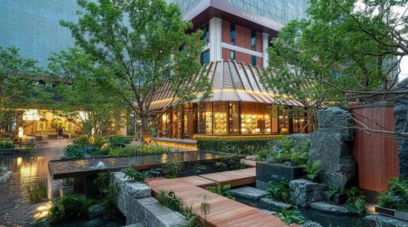其灵感源泉——崇州罨画池,不是被做成一个中式园林,而是被解构、提炼为现代空间的语言。
