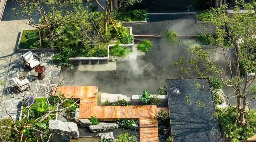 在社区的“叠石小院”,你看不到传统亭台楼阁,却能感受到罨画池的精髓。设计团队以“以石见山”的手法,让层叠的天然石材与静谧的水景形成微型山水画卷。