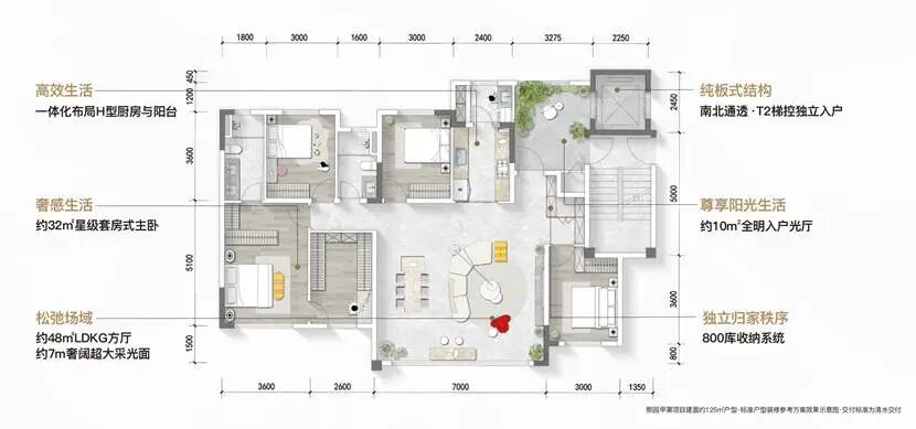 约10㎡的独立入户光厅可自由定义任意场景功能,约7米面宽的超大方厅,提供了近乎奢侈的社交与家庭活动空间。约32㎡的“主卧小家化”套房,整合了休憩、洗漱、收纳乃至阅读功能,营造出一个完全私属、高品质的庇护所。