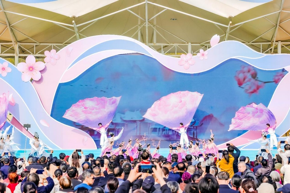 开幕式现场,一场融合古今的文化盛宴徐徐展开,成为诗经文化与樱花美景交融的最佳诠释。开场视频以“十有向新 美丽鹤壁”为主题,将淇河春色、樱花盛景与城市发展相融,勾勒出鹤壁建设“十有”内涵北方美丽城市的生动图景。舞蹈《樱动鹤壁》中,樱花仙子与仙鹤少年翩跹起舞,呈现鹤舞樱飞的唯美画面……