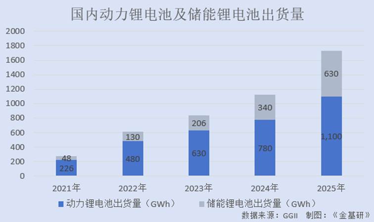 根据GGII数据,2021-2025年,国内动力锂电池出货量分别为226GWh、480GWh、630GWh、780GWh、1,100GWh,CAGR为48.53%;储能锂电池出货量分别为48GWh、130GWh、206GWh、340GWh、630GWh,CAGR达90.34%。