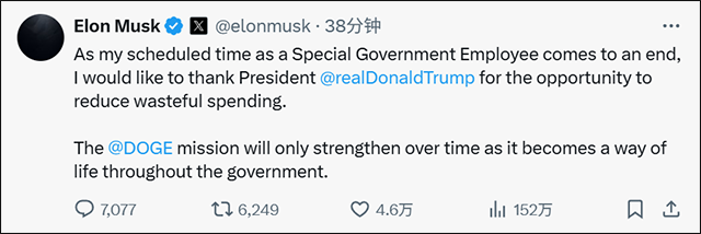 当地时间5月28日,马斯克在社交平台X上发帖宣布,他作为“特殊政府雇员”的任期即将结束。