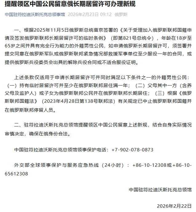据中国驻符拉迪沃斯托克总领事馆微信公众号2月23日消息,中国驻符拉迪沃斯托克总领馆提醒领区中国公民留意俄长期居留许可办理新规。