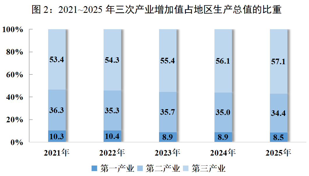 根据地区生产总值(GDP)统一核算初步结果,2025年四川省地区生产总值67665.3亿元,按不变价格计算,比上年增长5.5%。其中,第一产业增加值5751.4亿元,增长3.7%;第二产业增加值23260.2亿元,增长4.9%;第三产业增加值38653.8亿元,增长6.1%。三次产业结构为8.5∶34.4∶57.1,三次产业对经济增长的贡献率分别为6.7%、31.6%和61.7%。人均地区生产总值81124元,增长5.8%。