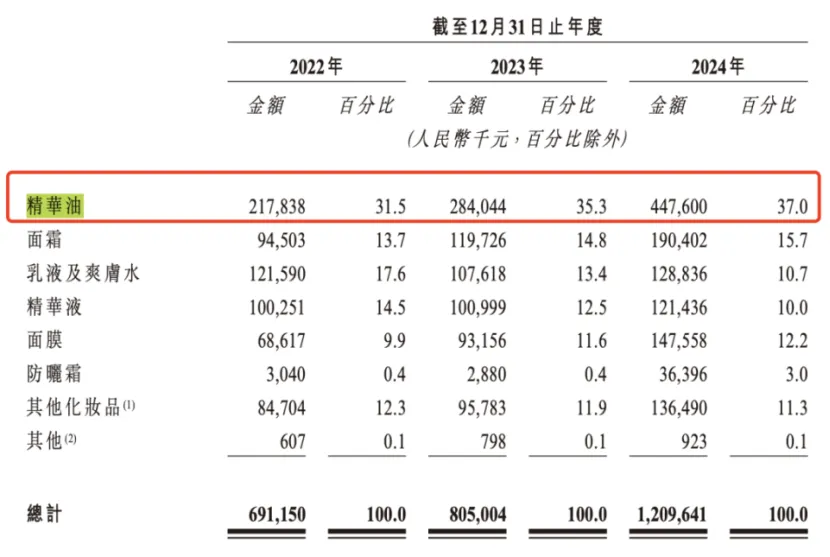 截至2024年12月31日 ,其核心产品山茶花抗皱修护精华油累计销量超3000万瓶,且连续11年在面部精华油全渠道零售额中领先。仅在2024年,山茶油精华油产品就贡献了4.48亿元的收入,几乎撑起了林清轩全年近四成的营收。