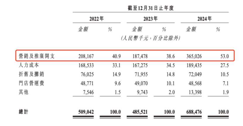 研发比重降低的同时却是营销端开销上涨,林清轩2024年的营销及推广开支高达3.65亿元,占销售及分销开支比重约53%;2023年,营销及推广开支占比为38.6%。