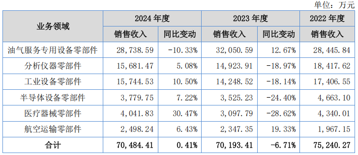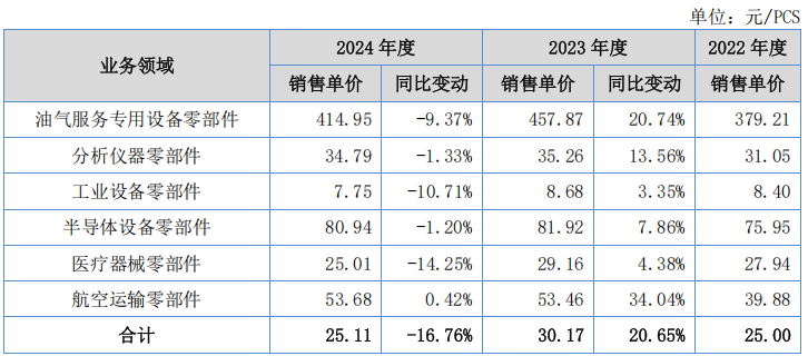 2024年,公司油气服务、工业设备、医疗器械领域零部件产品销售单价出现明显下滑。