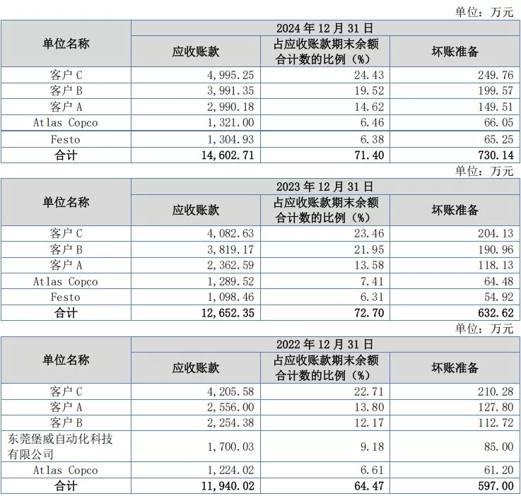 近年来,腾信精密重点深耕客户A、客户C、客户B、Festo、Atlas Copco等各领域的全球知名头部企业,导致客户集中度高。2022年、2023年、2024年,公司前五大客户收入占同期营业收入比例分别为68.78%、73.50%和72.05%。