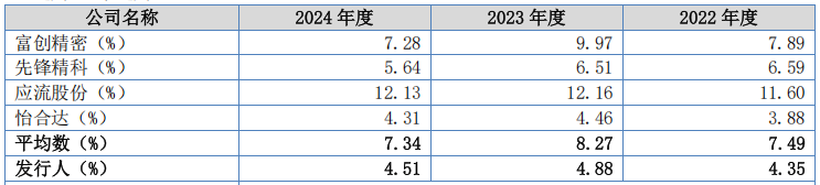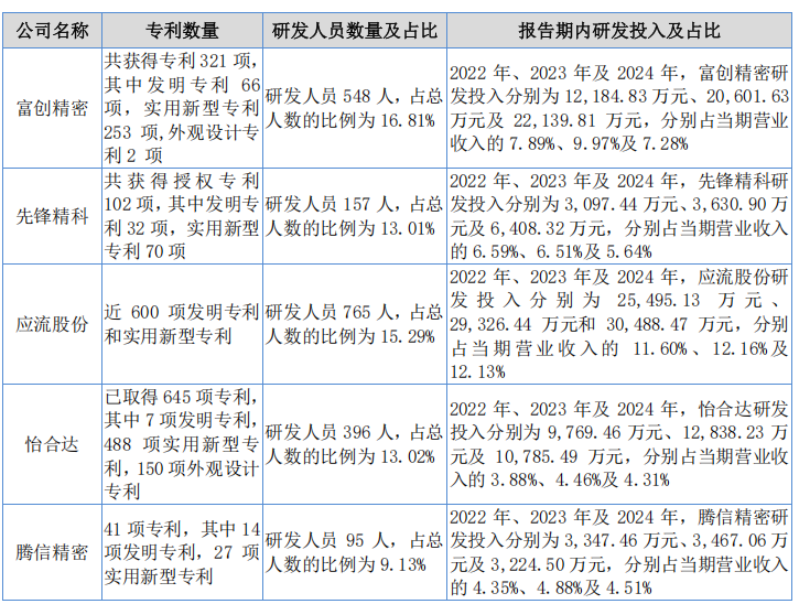 根据所处行业、主营业务和产品应用领域的类似性以及财务数据的可靠性和可比性,选取富创精密(688409)、先锋精科(688605)、应流股份(603308)、怡合达(301029)作为腾信精密的可比公司。