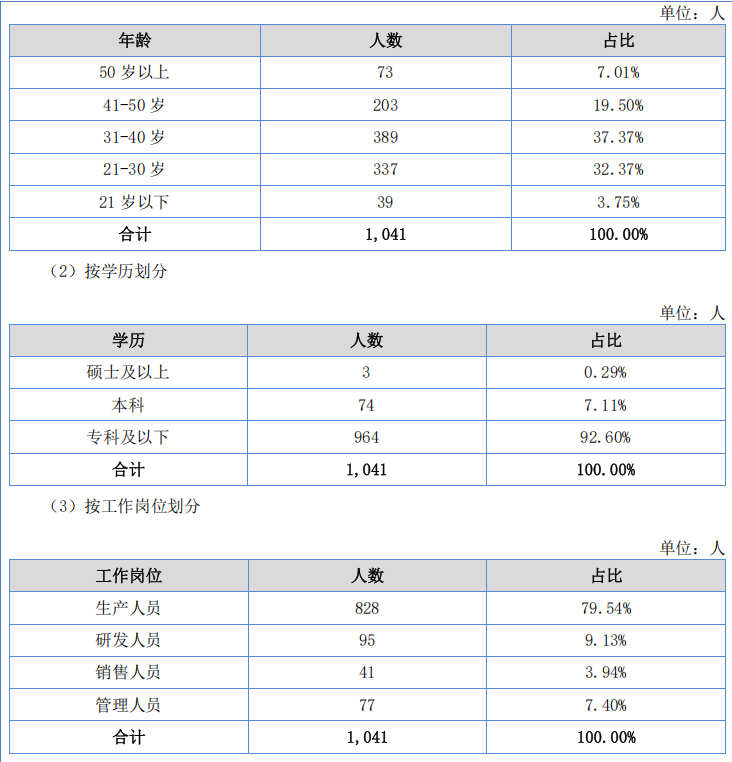 截至2024年12月31日,腾信精密正式员工的年龄、学历、工作岗位分布情况具体如下:
