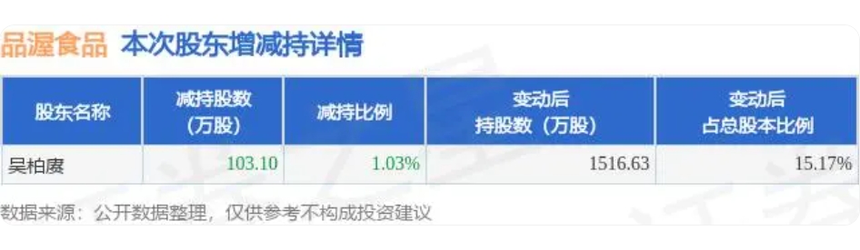 该事件余温尚存,品渥食品再发公告称,公司持股5%以上股东吴柏赓通过集中竞价交易、大宗交易方式减持公司股份103.1万股。截止公告日,吴柏赓上述减持股份行为累计减持股份比例已达到剔除公司回购专用账户股份后总股本的1%,其持股比例降至15.32%。