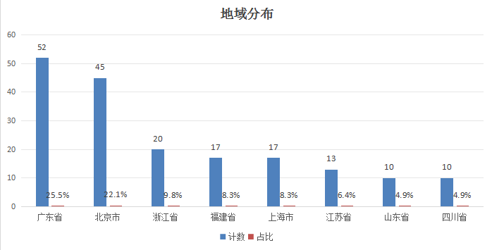 同花顺数据显示,截至10月18日收盘,A股鸿蒙概念一共有204家上市公司。从地域分布看,按省划分,涉及广东、北京、浙江、福建、上海、江苏、山东、四川等全国22地。其中,广东和北京分别以52家和45家的数量遥遥领先。