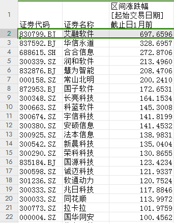 从区间涨跌幅表现看,近一个月涨幅超过100%的有21家上市公司。其中,艾融软件、华信永道、合合信息、润和软件、慧为智能、常山北明6家公司涨幅超过200%。