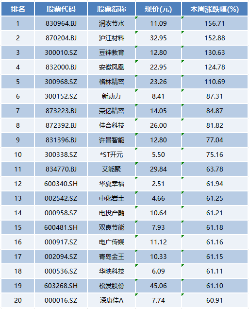 排在涨幅榜第二名的是沪江材料(870204.BJ),本周累计上涨152.88%。沪江材料在光伏领域的创新引发市场关注。据了解,该公司自主研发出一款性能优异且价格具竞争力的光伏背板专用薄膜。该产品性能优异,并且更具成本优势,现已被多家光伏背板企业采用。随着光伏行业的快速发展,沪江材料有望持续受益。本周光伏板块出现明显反弹,而沪江材料成为涨幅较大的个股之一。