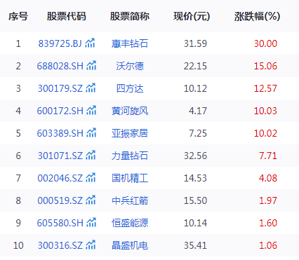12月3日,培育钻石概念持续活跃,截至收盘,惠丰钻石、黄河旋风、亚振家居等多股涨停,沃尔德涨超15%,四方达涨超12%,力量钻石涨超7%。