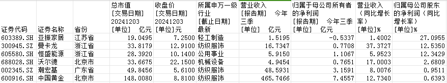 从业绩表现看,今年前三季度实现归母净利润和营业收入均实现同比增长的有6家公司,分别是亚振家居、曼卡龙、恒盛能源、沃尔德、潮宏基、中国黄金。