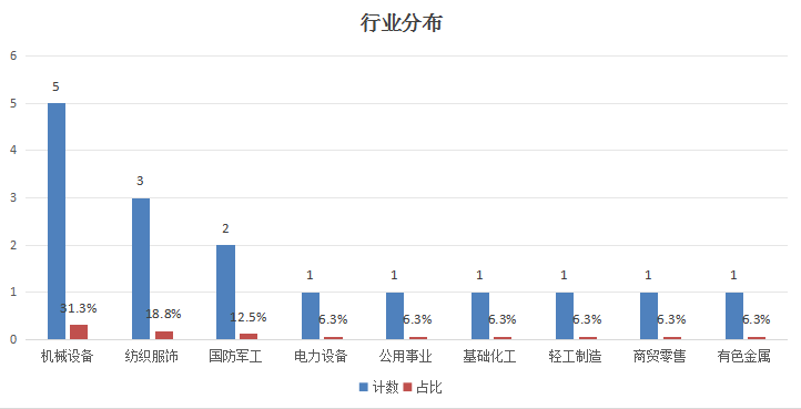 从行业分布看,按照申万一级行业划分,涉及机械设备、纺织服饰、国防军工、电力设备、公用事业、基础化工、轻工制造、商贸零售、有色金属9个行业。