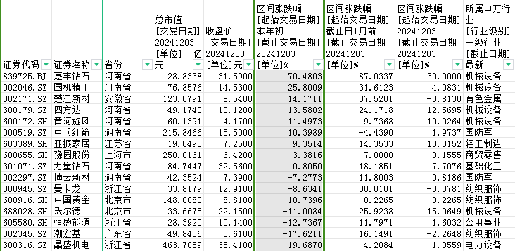 从近一月表现看,股价涨幅超过10%的有11家,其中,惠丰钻石、楚江新材、国机精工、曼卡龙4家涨幅超过30%。