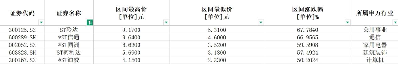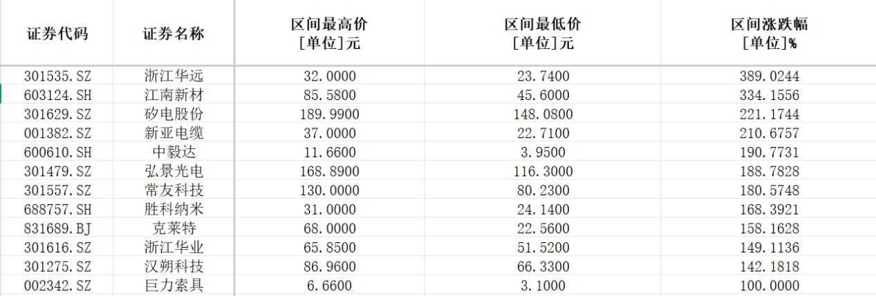 涨幅超过300%的2家上市公司分别为浙江华远、江南新材;涨幅超过200%的2家上市公司分别为矽电股份、新亚电缆;涨幅超过100%的上市公司为汉朔科技、浙江华业、胜科纳米、常友科技、弘景光电。