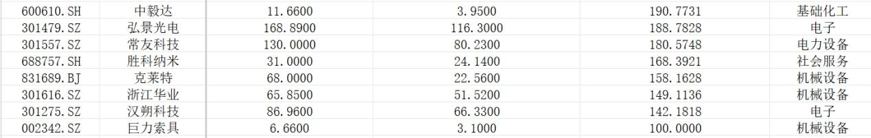 根据同花顺数据,涨幅超100%的上市公司中非新股的有巨力索具、克莱特、中毅达;分别上涨100%、158.16%、190.77%。