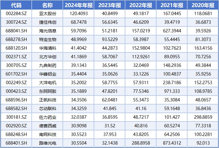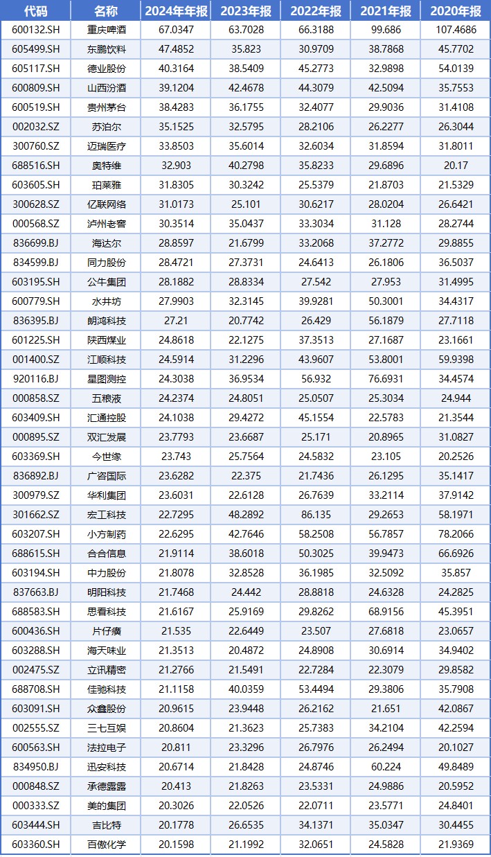 同花顺数据显示,2020年-2024年,连续5年ROE大于20%的上市公司一共有43家,具体包括: