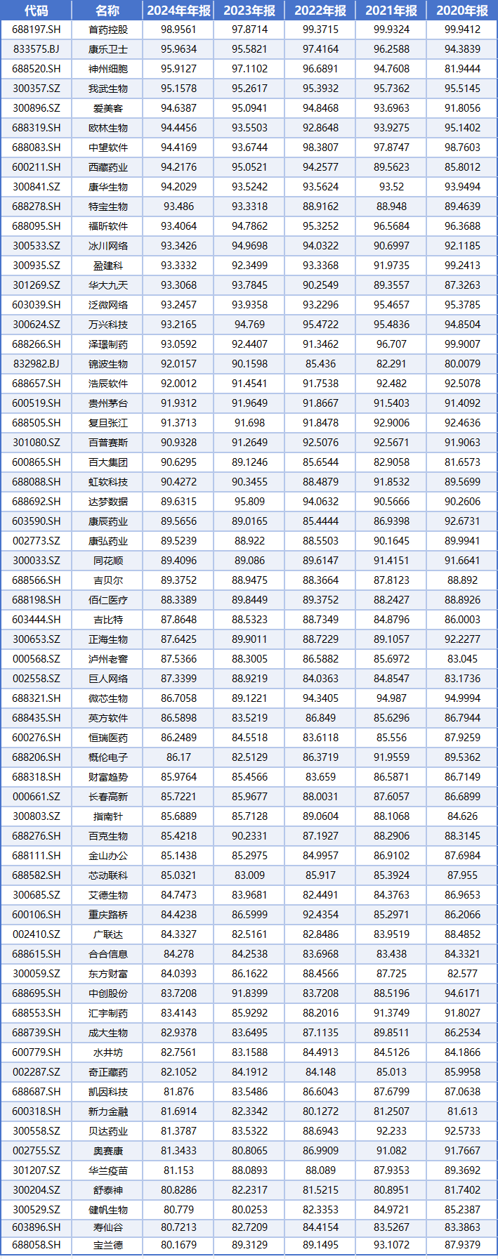 同花顺数据显示,2020年-2024年,连续5年毛利率大于80%的上市公司一共有63家。其中,连续5年毛利率大于90%的有20家,具体包括: