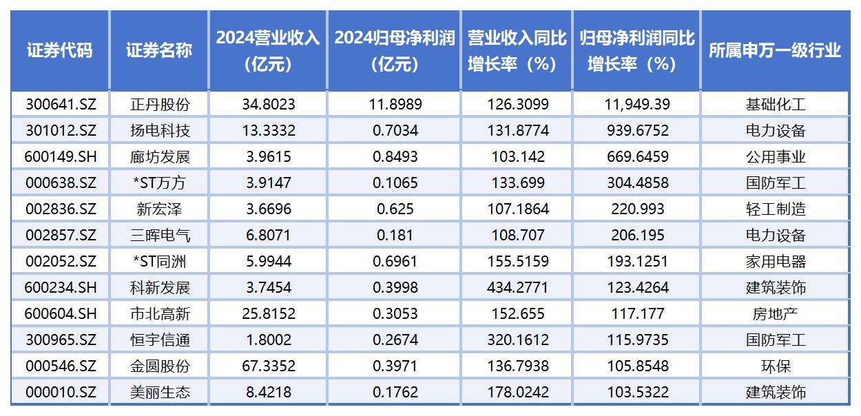 其中,正丹股份、扬电科技、廊坊发展、*ST万方、新宏泽、三晖电气、*ST同洲、科新发展、市北高新、恒宇信通、金圆股份、美丽生态等12家上市公司2024年营业收入和归母净利润均实现同比增长超过100%,算得上“被埋没的金子”。