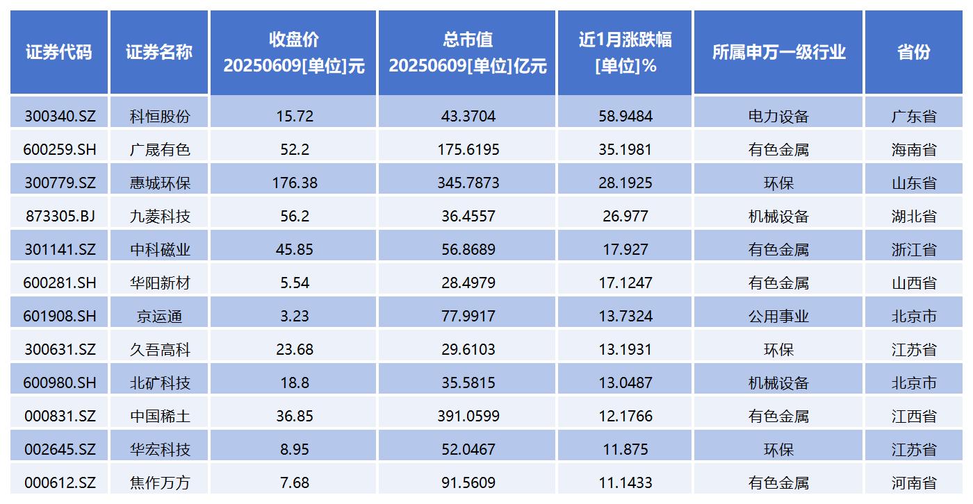从二级市场表现看,近一月以来,股价涨幅超过10%的有12只个股,具体包括科恒股份、广晟有色、惠城环保、九菱科技、中科磁业、华阳新材、京运通、久吾高科、北矿科技、中国稀土、华宏科技、焦作万方。