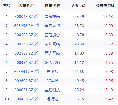 6月11日,A股游戏板块走高,电魂网络涨停,星辉娱乐涨超10%,冰川网络、巨人网络等跟涨。