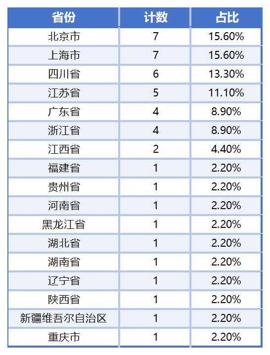 从地域分布看,按照省份划分,北京、上海均有7家,占比15.6%;四川有6家,占比13.3%;江苏有5家,占比11.1%。