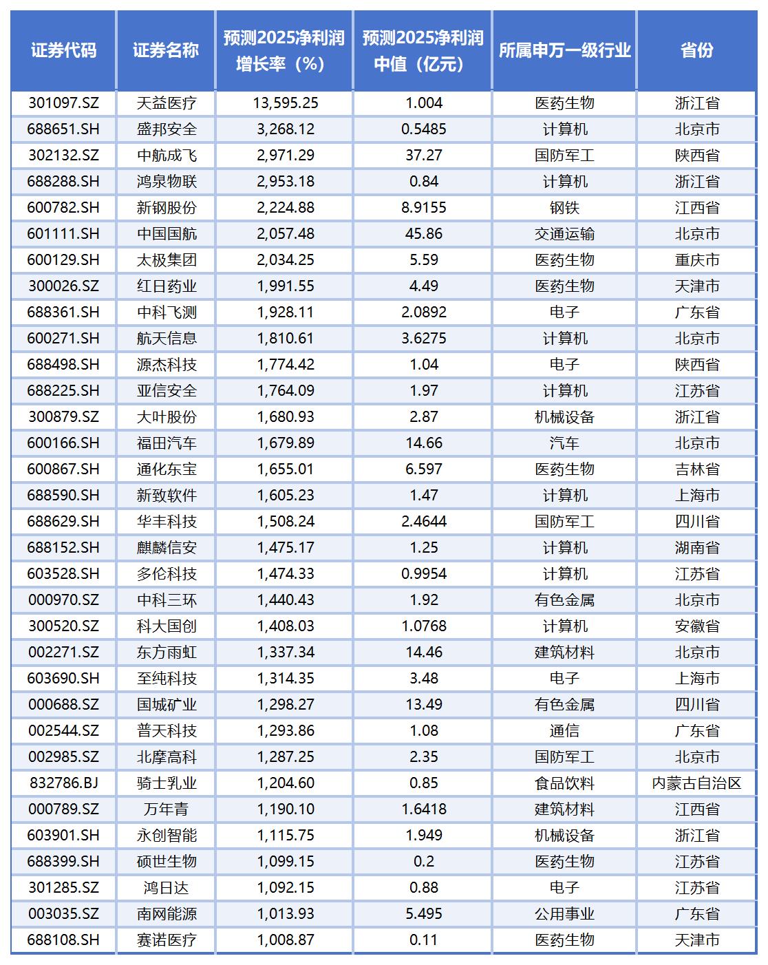 同花顺数据显示,截至6月15日,33只个股预测2025净利润增长率超过1000%。