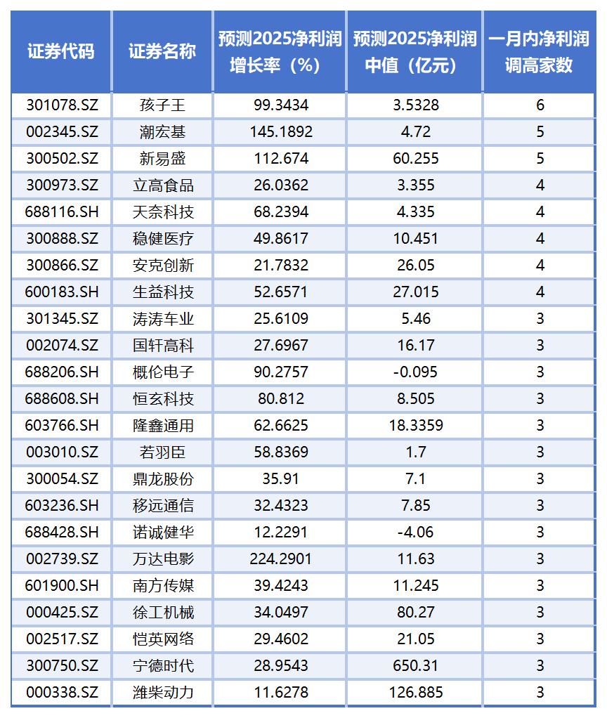 此外,23家上市公司预测净利润获3家及以上机构调高。其中,孩子王、潮宏基、新易盛或较多机构青睐。