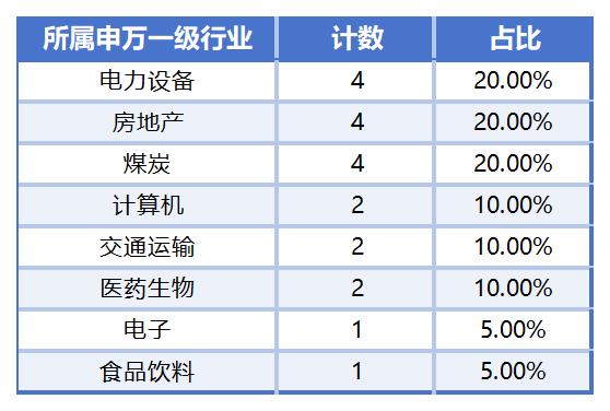从行业分布看,按照申万一级行业分类,电力设备、房地产、煤炭各有4家,占比20%;计算机、交通运输、医药生物各有2家,占比10%。