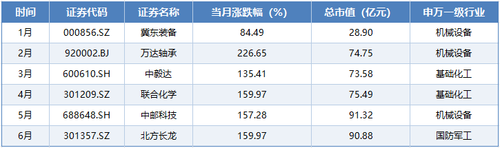 从每个月来看,单月牛股的涨幅同样很“诱人”。除1月外,2月至6月的月度涨幅全部超过100%。其中,2月份的万达轴承(920002.BJ)单月涨幅达到226.65%。以下是月度涨幅最大的股票: