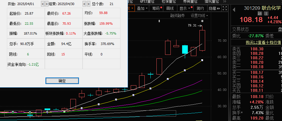 联合化学的主要业务为偶氮类有机颜料、挤水基墨的研发、生产与销售,其产品主要应用于油墨、印刷、涂料等领域。随着开始布局半导体材料市场,联合化学的股价在4月开启“狂飙”模式,21个交易日股价累计上涨160%。