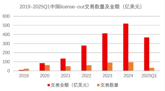 根据医药魔方的数据,中国药企license-out(海外授权)交易数量从2018年的17项增长至2024年的94项;license-out交易首付款从2018年的2亿美元增长至2024年的41亿美元;2024年中国企业license-out总交易金额达519亿美元。而在2025年第一季度,中国创新药企License-out交易总额达到369亿美元,同比增长222%。