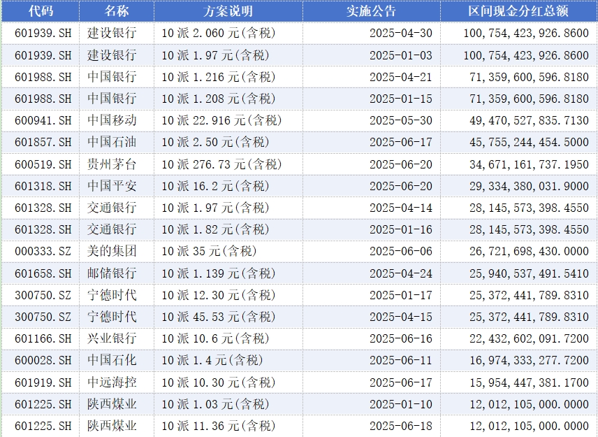 数据显示,上半年累计分红金额超百亿的上市公司有建设银行、中国银行、中国移动、中国石油、贵州茅台、中国平安、交通银行、美的集团、邮储银行、宁德时代、兴业银行、中国石化、中远海控、陕西煤业。