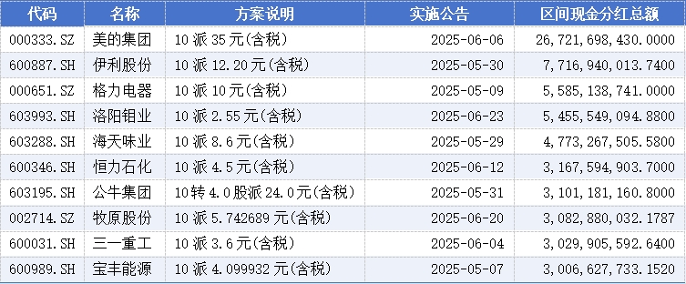 包括美的集团在内,伊利股份、格力电器、洛阳钼业、海天味业、恒力石化、公牛集团、牧原股份、三一重工、宝丰能源为民营企业上半年分红金额的前10名。