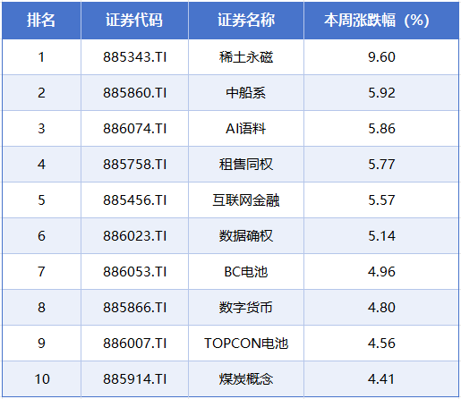 板块方面,本周涨幅居前的概念板块分别是稀土永磁、中船系、AI语料、租售同权、互联网金融,累计涨幅分别为9.6%、5.92%、5.86%、5.77%、5.57%。