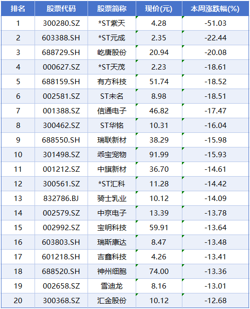 本周个股跌幅榜前五位分别是*ST紫天、*ST元成、屹唐股份、*ST天茂、有方科技,累计跌幅分别为51.03%、22.44%、20.08%、18.61%、18.52%。