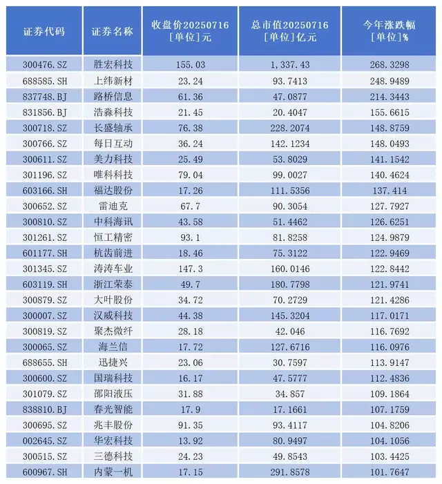 从二级市场表现看,截至7月16日收盘,今年以来,共有707家上市公司股价实现上涨,其中,27家涨幅超过100%,胜宏科技(300476.SZ)以268.33%的涨幅位居第一。