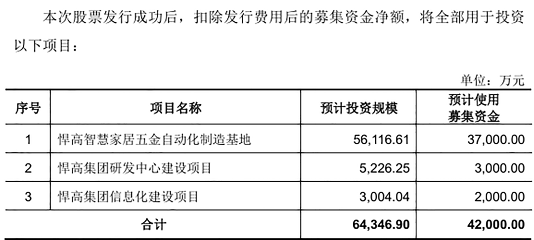 悍高集团IPO发行新股4001万股,募资基金6.17亿元,拟投入3个项目。其中,悍高智慧家居五金自动化制造基地投资总额56116.61万元,悍高集团研发中心建设项目投资总额5226.25万元,悍高集团信息化建设项目投资总额3004.04万元。